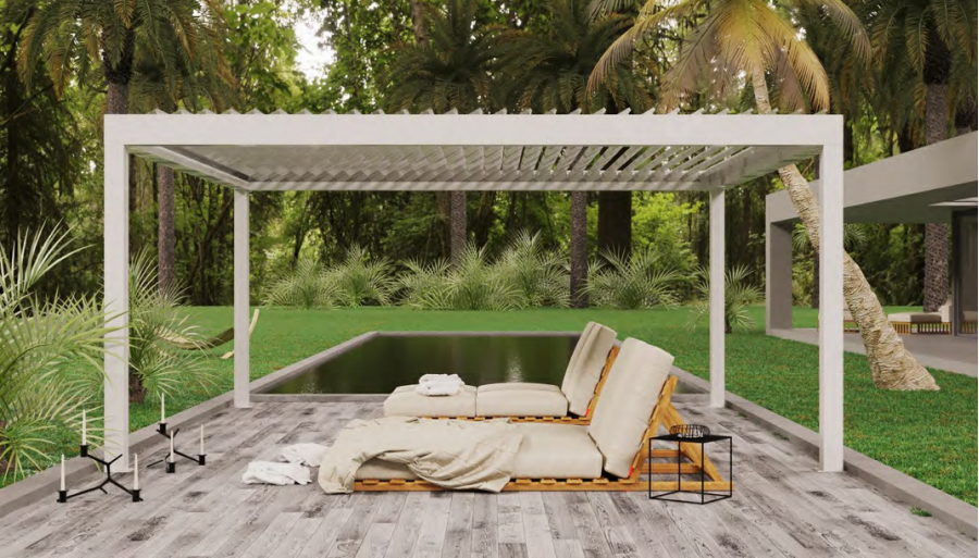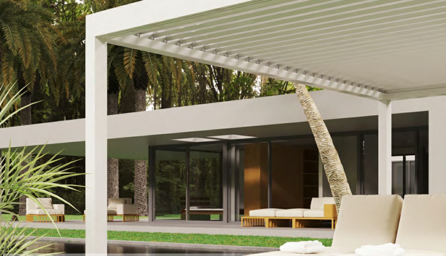Pergola BIOCLIMATICA in piano autoportante completa di sistema di copertura a lamelle orientabili.